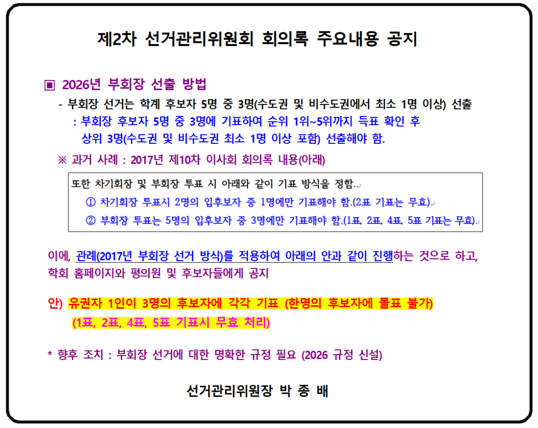 2026년 부회장 선출 방법에 대한 제2차 선거관리위원회 회의록 내용 공지